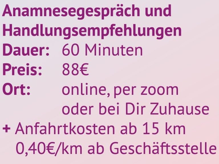 Von Anfang an werdet ihr ganzheitlich von mir begleitet. Deshalb sende ich Euch vor unserem ersten persönlichen Kennenlernen meinen hündischen Anamnesebogen per E-Mail zu, den Du ausgefüllt und unterschrieben zurückschickst.